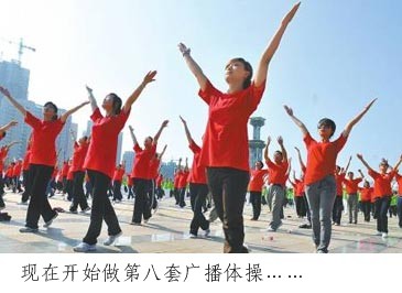8月9日起,北京人民廣播電臺體育廣播(調(diào)頻102.5兆赫)將在每天上午10點和下午3點恢復(fù)播出廣播體操的音樂。到時候,北京市總工會將對機關(guān)、企事業(yè)單位總共400萬職工推行第8套廣播體操,時長為8分鐘。