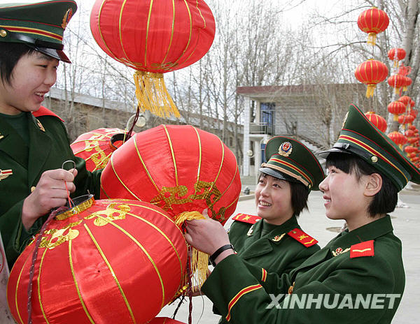 1月20日,武警西藏總隊(duì)通訊站的女戰(zhàn)士在營區(qū)掛紅燈籠。新華社發(fā)(趙艷志 攝)