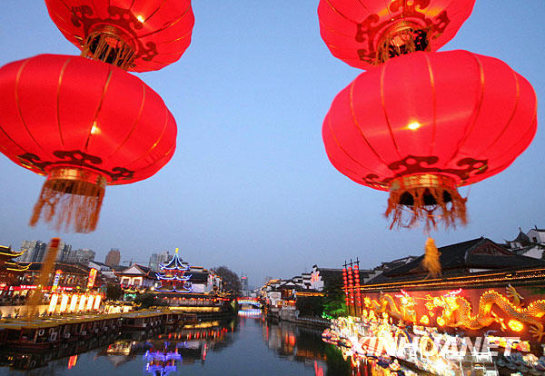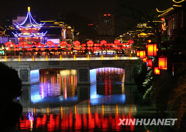 1月23日晚,南京夫子廟文德橋附近燈光璀璨,流光溢彩。 當(dāng)日,2009年中國南京夫子廟——秦淮河風(fēng)光帶國際燈會亮燈。本屆燈會從1月26日正式開始。屆時,50組大中型燈組、40萬盞手工扎制的花燈將把夫子廟景區(qū)裝點(diǎn)成燈的世界、花的海洋。新華社發(fā)(李文寶 攝)
