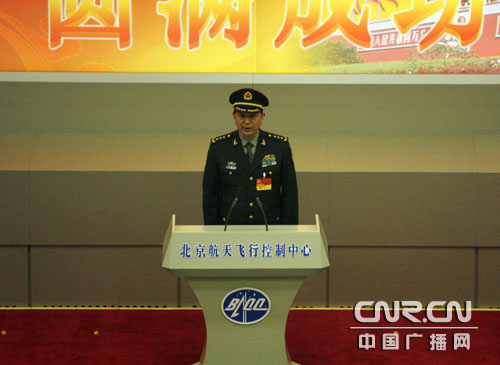 載人航天工程總指揮、中央軍委委員、解放軍總裝備部部長(zhǎng)常萬(wàn)全部長(zhǎng)宣布神舟七號(hào)載人航天飛行任務(wù)結(jié)果。(中廣網(wǎng)記者南光 曹囡囡攝)