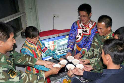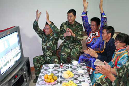 9月25日,內(nèi)蒙古烏蘭察布市公安邊防支隊(duì)官兵與當(dāng)?shù)啬撩裢嬆滩铓g慶“神七”成功發(fā)射。