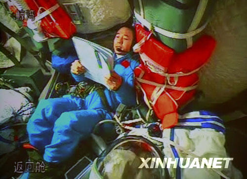 9月26日,航天員景海鵬在神舟七號(hào)載人飛船返回艙內(nèi)與北京飛控中心通話(攝于北京航天飛行控制中心大屏幕)。25日發(fā)射成功的神舟七號(hào)載人飛船運(yùn)行正常。新華社記者 查春明 攝