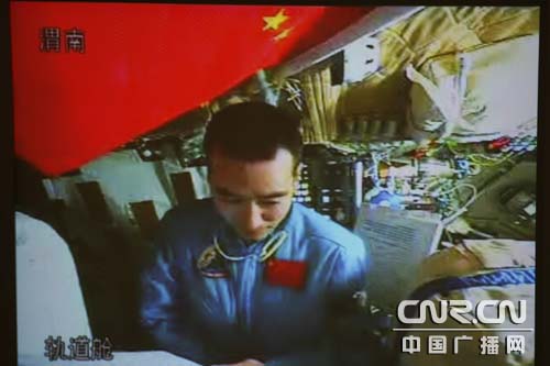航天員翟志剛正在軌道艙測試天地通話的性能 中廣網(wǎng)記者南光 曹囡囡 攝