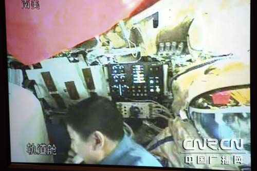 指揮大廳顯示屏出現(xiàn)神舟七號艙外畫面及美麗的藍色地球 中廣網(wǎng)記者南光 曹囡囡 攝
