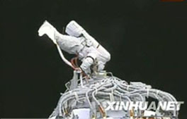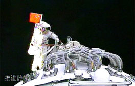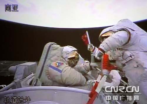 航天員翟志剛揮動(dòng)著五星紅旗漂浮在太空。(中廣網(wǎng)記者南光 曹囡囡攝)