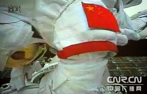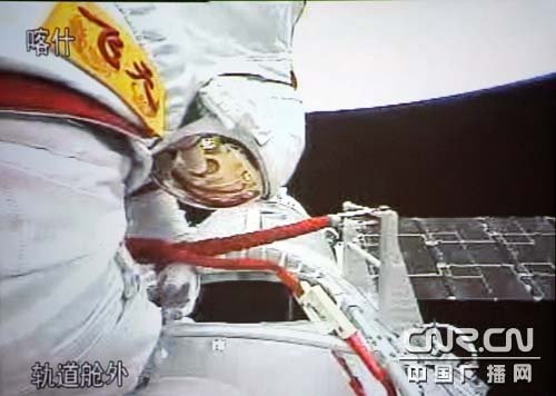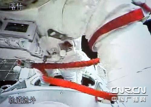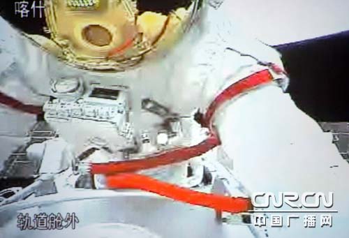 航天員翟志剛正在返回軌道艙,似乎有些依依不舍。(中廣網(wǎng)記者南光 曹囡囡攝)
