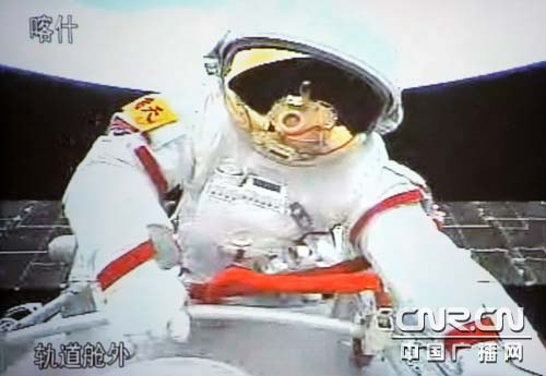 航天員翟志剛身著我國自主研制的艙外航天服“飛天”。(中廣網(wǎng)記者南光 曹囡囡攝)