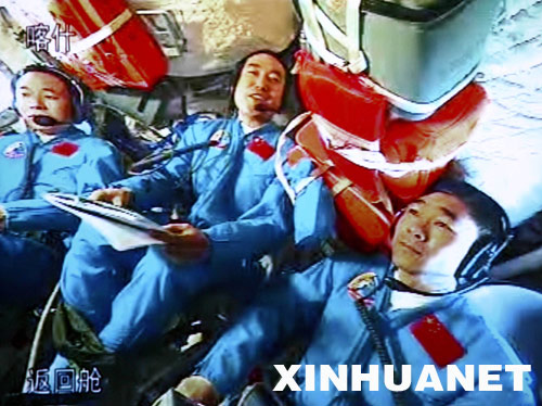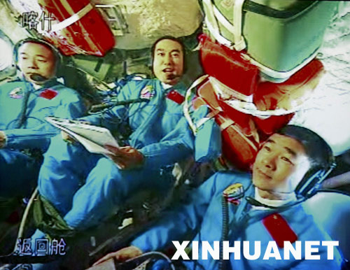 這是航天員翟志剛(中)、劉伯明(右)、景海鵬在和胡錦濤總書記通話。新華社記者陳建力攝
