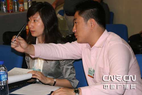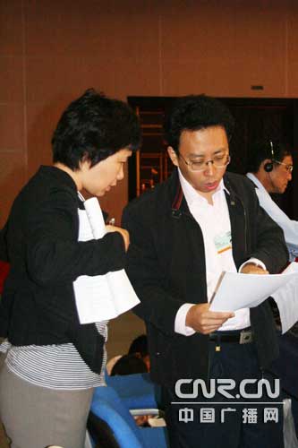 中央臺(tái)記者馮悅與大連站記者賈鐵生討論連線報(bào)道計(jì)劃