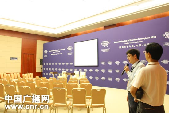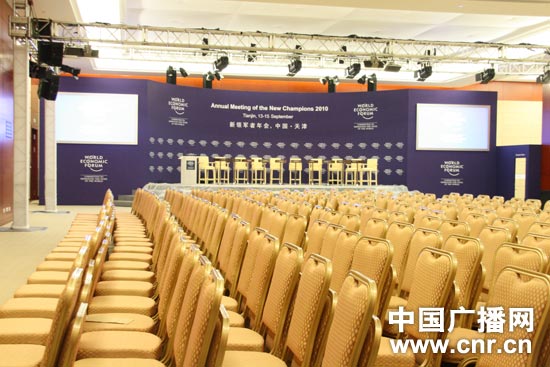 15日,2010夏季達(dá)沃斯論壇的閉幕式將在這間名為“達(dá)沃斯”的會(huì)議廳舉行。(中廣網(wǎng)記者朱虹 攝)