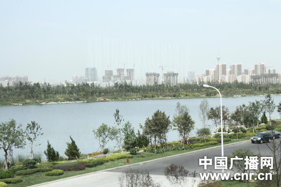 在梅江會(huì)展中心前面,景觀湖綠化工程修葺一新。(中廣網(wǎng)記者朱虹 攝)