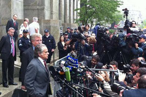 資料圖片:5月16日,國際貨幣基金組織總裁多米尼克·斯特勞斯-卡恩(右)出席紐約曼哈頓刑事法院舉行的聽證會。在...