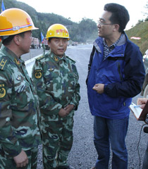 中央臺記者孫杰、王嫻、梁永春在施工現(xiàn)場采訪90后武警戰(zhàn)士