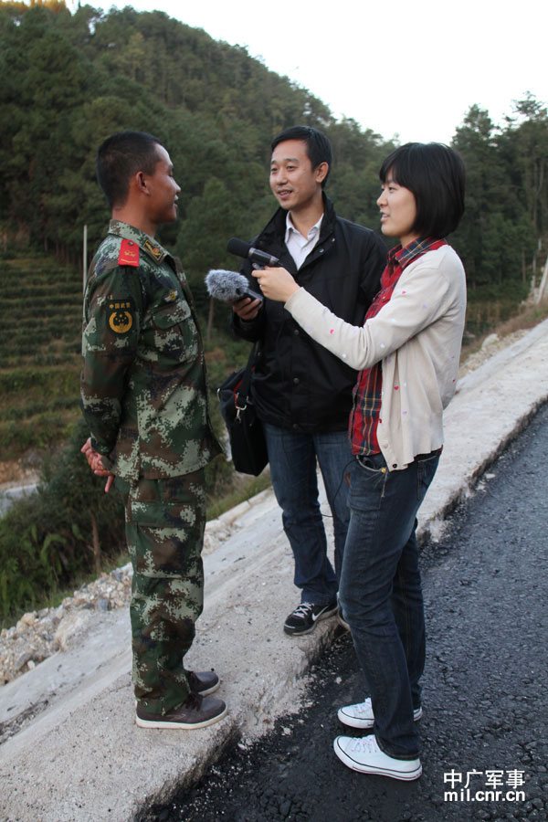 中央臺記者孫杰、王嫻采訪武警交通部隊?wèi)?zhàn)士(中央臺記者劉鵬攝)