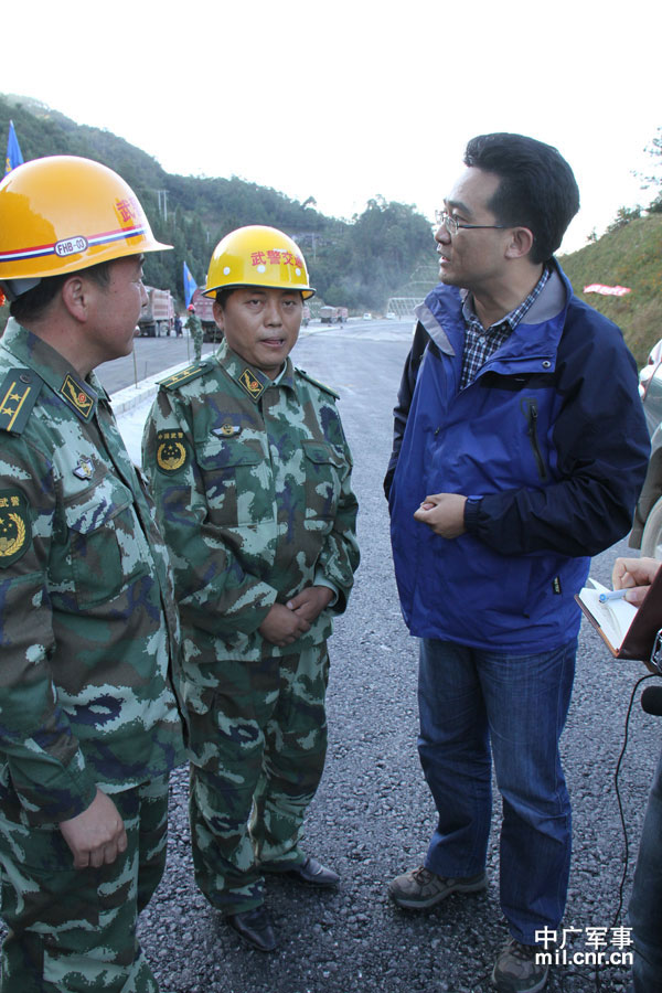 中央臺記者梁永春采訪武警交通部隊官兵(中廣網(wǎng)記者劉鵬攝)