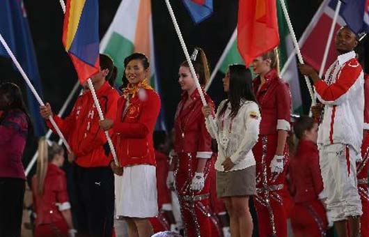 8月12日,第30屆夏季奧林匹克運動會閉幕式在倫敦奧林匹克體育場舉行。這是中國代表團旗手、奧運會女子激光雷迪爾級冠軍徐莉佳(右三)在閉幕式上高舉五星紅旗入場。這是中國代表團旗手、奧運會女子激光雷迪爾級冠軍徐莉佳(中)在閉幕式上手舉五星紅旗入場。