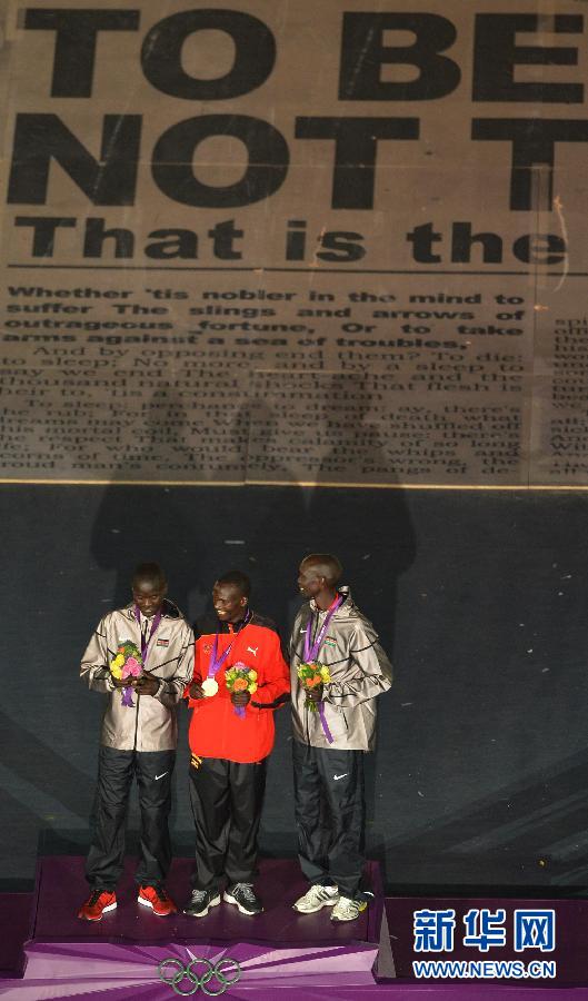 2012年8月12日,第三十屆夏季奧林匹克運(yùn)動(dòng)會(huì)閉幕式在倫敦奧運(yùn)會(huì)主體育場(chǎng)舉行。圖為閉幕式上舉行的男子馬拉松頒獎(jiǎng)儀式。當(dāng)日,在2012倫敦奧運(yùn)會(huì)男子馬拉松比賽中,烏干達(dá)選手斯蒂芬·基普羅蒂奇(中)以2小時(shí)08分01秒的成績(jī)奪冠。 新華社記者 王慶欽 攝