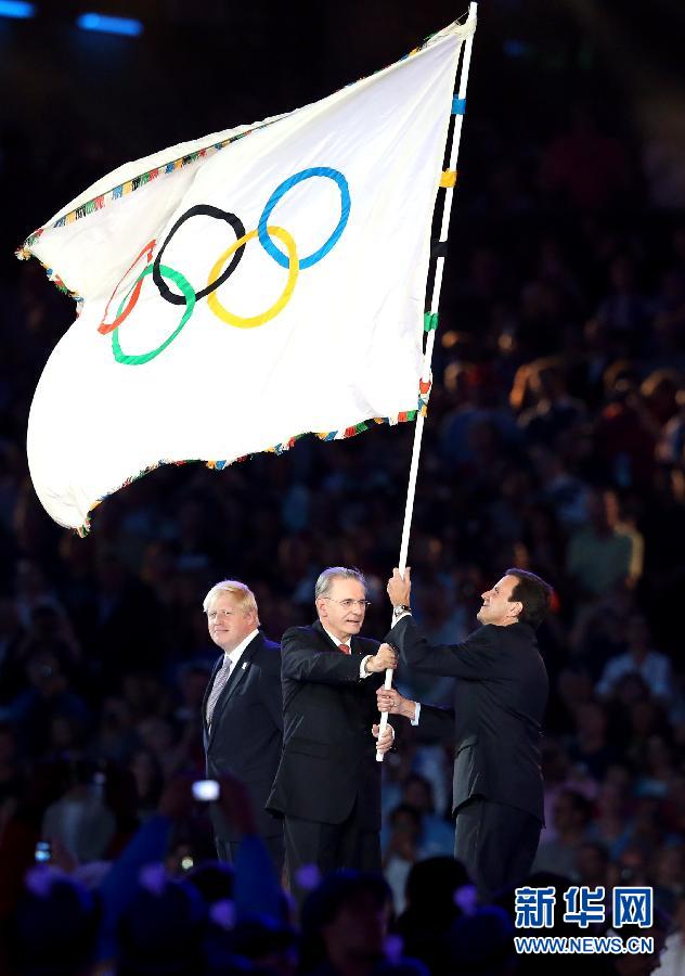 8月12日,第30屆夏季奧林匹克運(yùn)動(dòng)會(huì)閉幕式在倫敦奧林匹克體育場(chǎng)舉行。這是閉幕式上,國際奧委會(huì)主席羅格(中)將奧林匹克會(huì)旗交給下屆夏季奧林匹克運(yùn)動(dòng)會(huì)舉辦地巴西里約熱內(nèi)盧市市長愛德華多·帕伊(右)。新華社記者凡軍攝