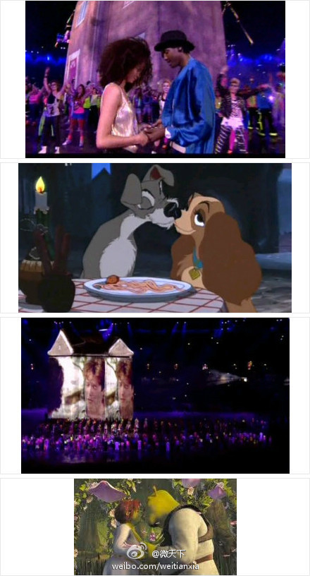 她,頭發(fā)蓬松,手如柔荑,膚如凝脂;他,頭戴禮帽,儀表堂堂,愛意滿倉;兩人緩緩從人群中走向?qū)Ψ,嬌羞,?qiáng)忍,擁吻,融化。大屏幕適時放出影史經(jīng)典吻戲,從休-格蘭特到史萊克,從一見鐘情到厚積薄發(fā);若我知如何舍棄你,那該多好。這么確切的愛,一生只有一次。