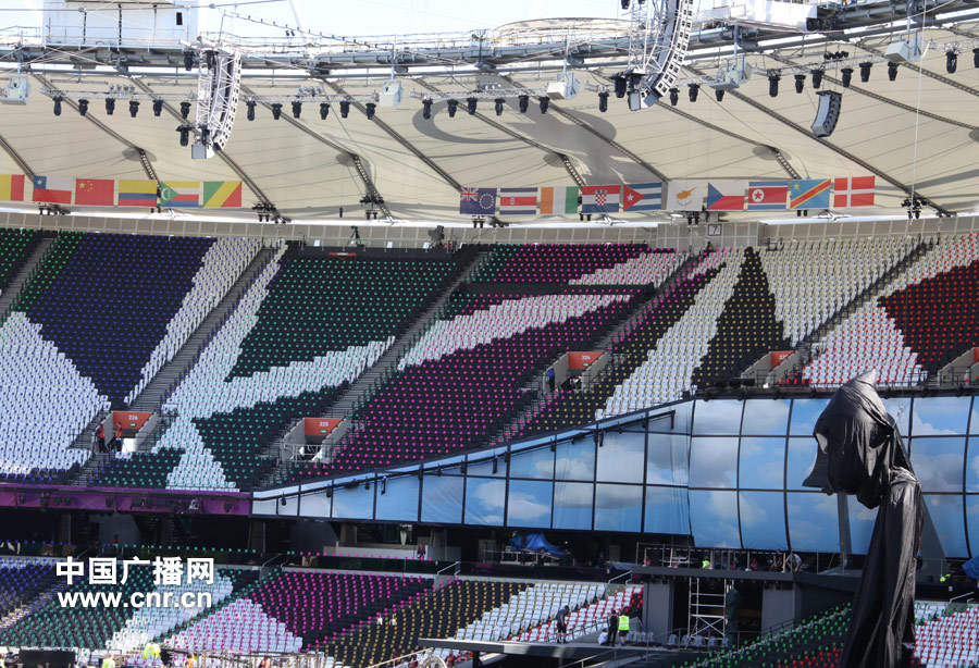 初始我以為為了讓觀眾靠的更加舒服,實際上,它是由9個可變化顏色的小燈泡組成。于是,當總導演需要時,整個倫敦碗的觀眾席都可呈現(xiàn)出一副波瀾壯闊、五顏六色的音樂的奏章。(中廣網特派記者束偉發(fā)自倫敦)