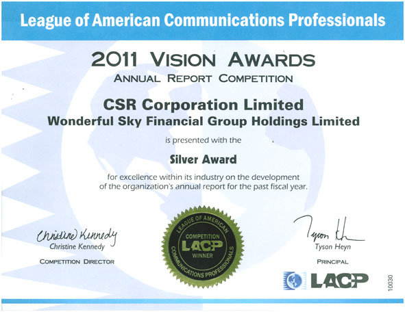 中國南車2011年年度報告在本屆評選中獲得97分(評選為百分制),在“致股東書函、內(nèi)文敘述、財務(wù)摘要、創(chuàng)意設(shè)計、信息易讀性“等單項中均獲得滿分。LACP的總經(jīng)理Christine Kennedy表示:“中國南車在今年的激烈競爭中表現(xiàn)卓越,以優(yōu)異的水準(zhǔn)獲得評委的青睞,總體上看,中國南車這次的表現(xiàn)接近完美。我們認(rèn)為中國南車在本次比賽中的表現(xiàn)是這個行業(yè)當(dāng)中最優(yōu)秀的”。美國媒體專業(yè)聯(lián)盟年度報告“遠(yuǎn)見獎”是備受業(yè)界尊崇的年報評選國際獎項之一,由世界著名營銷調(diào)查機(jī)構(gòu)——美國通訊聯(lián)盟公司組織評選,在業(yè)界年報選舉中擁有重要地位。