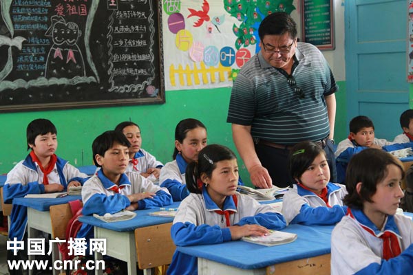 采訪團成員,新疆記者站站長胡志堅在采訪現(xiàn)場了解雙語教學情況