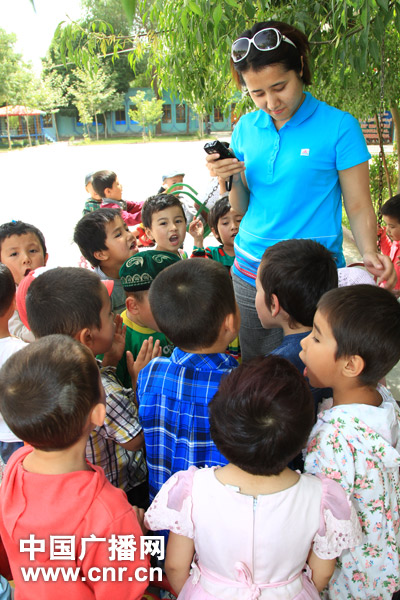 中央臺新疆民族語言廣播中心記者奴爾古力·依米爾在雙語幼兒園采訪中