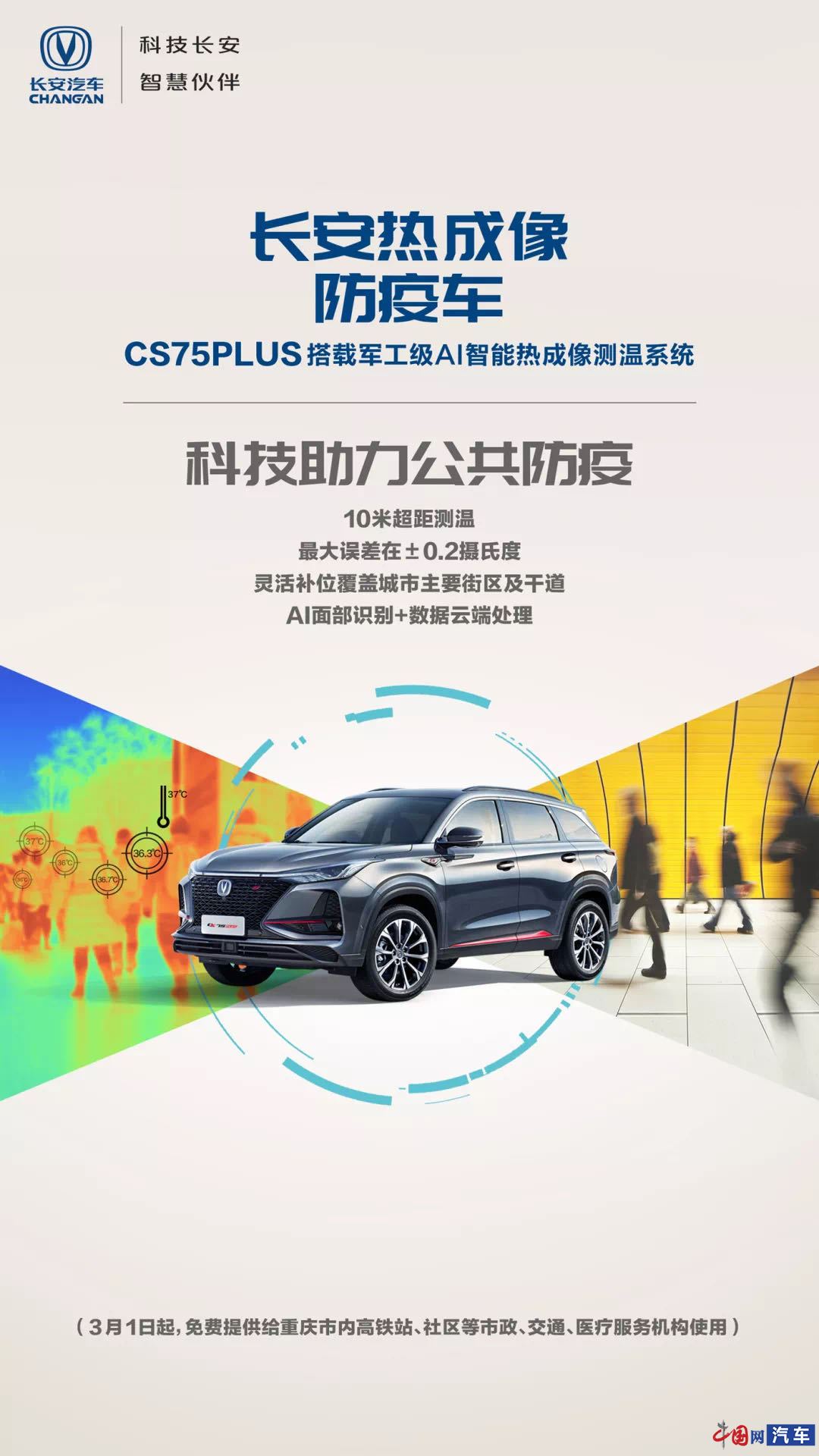 日前,長安汽車推出了熱成像防疫車——搭載軍工級AI智能熱成像測溫系統(tǒng)的CS75PLUS。并且自3月1日起,將免費提供給重慶市內高鐵站 、社區(qū)等市政、交通、醫(yī)療服務機構使用。