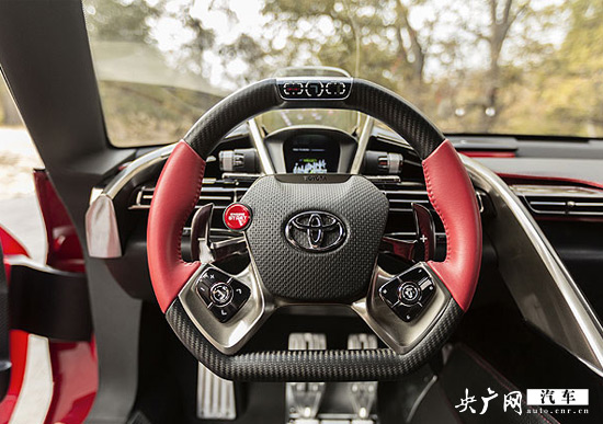 從現(xiàn)場的照片上看,全新豐田FT-1的設計更加具有攻擊性,是一款動力十足的運動跑車。同時,全新豐田FT-1也預示著未來豐田汽車的設計理念。雖然造型略顯浮夸,但是在空氣動力學套件上還是能看出,豐田是下了一番功夫的。