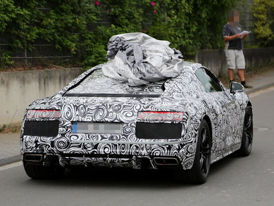 從測試車的外觀來看,新一代R8在外觀設(shè)計上使用了全新的元素:全新的頭燈設(shè)計,頭燈的形狀與TT一樣變得非常銳利;中央進氣格柵同樣變?yōu)閹в袖J角的六邊形造型。新一代R8的側(cè)面比例造型與現(xiàn)款車型相近,同樣在車門后方有為中置引擎提供散熱的通風(fēng)孔,但車尾卻完全不同。尾燈使用了類似于現(xiàn)款車型的設(shè)計,但尾燈的造型同樣變得更為平直,尾燈毫無疑問由LED發(fā)光元件組成,開口向上的“C”形LED燈帶環(huán)繞尾燈一周。在尾部下方則是大面積的擴散器和方形的雙邊雙出排氣尾喉。