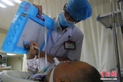 2017年1月27日,濱州醫(yī)學(xué)院附屬醫(yī)院急診科重癥監(jiān)護(hù)室醫(yī)生在給患者做檢查。中新網(wǎng)邱宇 攝