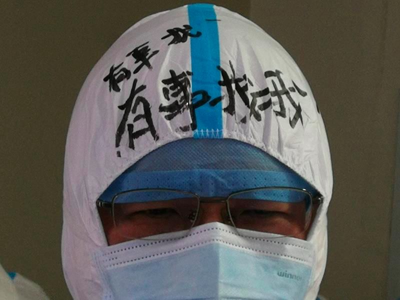 在隔離病房?jī)?nèi),當(dāng)醫(yī)護(hù)人員穿上防護(hù)服,帶上口罩和護(hù)目鏡以后,互相之間難以辨識(shí)。有隊(duì)友問(wèn):“有事兒找誰(shuí)?”丁新民立刻回答:“有事找我!”話(huà)音剛落,只見(jiàn)丁新民真的把頭低下,“有事找我”4個(gè)大字就這樣“頂”在了他的額頭上。