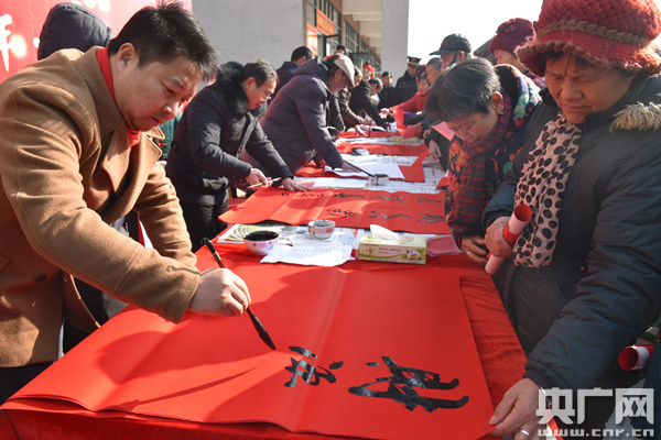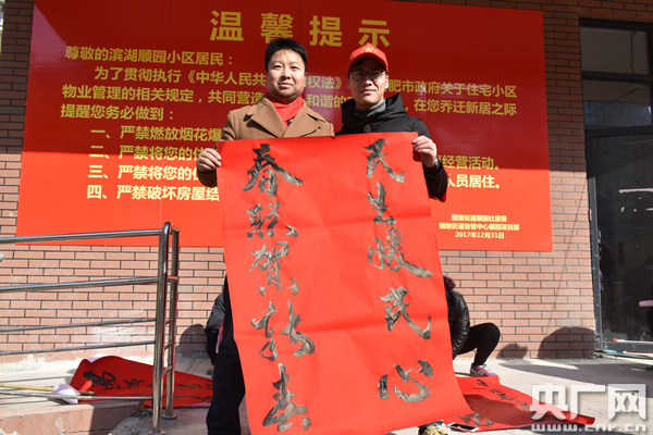 活動(dòng)現(xiàn)場(chǎng),書法老師和書法愛好者們現(xiàn)場(chǎng)書寫春聯(lián),“民生政策好、幸福萬年長(zhǎng);民生暖人心、歡樂賀新春;民生暖民心、春聯(lián)賀新年;民生年年好、生活步步高”等一幅幅寄托新春祝福、反映民生政策的春聯(lián)送到居民手中。