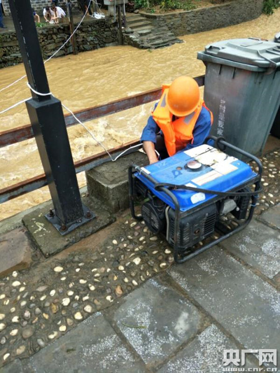 昨天上午10時,池州市許村通信設施由于洪澇災害,電力引入受損,基站供電收到威脅,影響周邊240戶居民的正常通信。為此,池州市應急通信管理辦公室立即組織人員開展搶修,由于水勢較大,搶修又需要過河發(fā)電,汽油發(fā)電機運輸存在危險,搶險人員只好將電纜綁在身上,利用皮劃艇過河,跨河發(fā)電。
