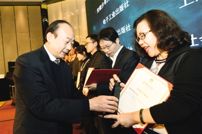 中國(guó)書(shū)刊發(fā)行業(yè)協(xié)會(huì)理事長(zhǎng)艾立民為年度出版社頒獎(jiǎng)。