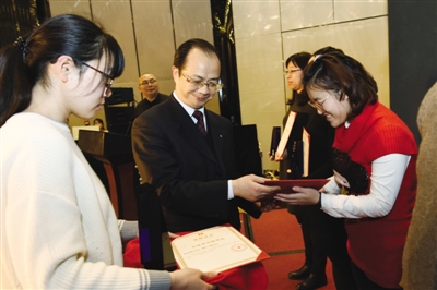 安徽出版集團(tuán)黨委書(shū)記、董事長(zhǎng)王民為2017年度校園書(shū)店頒獎(jiǎng)。