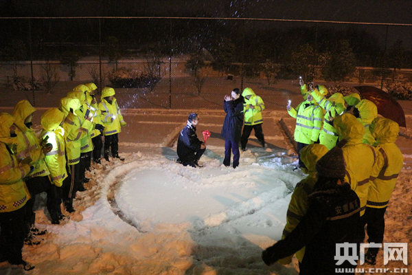 1月25日晚19時(shí)許,一名員工把魯亞萍“騙”到現(xiàn)場,面對此情此景和單膝下跪遞上“鮮花”的小查,小魯感動(dòng)地?zé)釡I盈眶。兩人在風(fēng)雪中相擁,眾人舉起手機(jī)拍下視頻和照片為他們歡呼喝彩。隨后,眾人將視頻和照片轉(zhuǎn)發(fā)至中心微信群,贏得了更多的祝福與點(diǎn)贊。簡短的儀式后,全員又重新回到緊張的鏟冰除雪工作中。