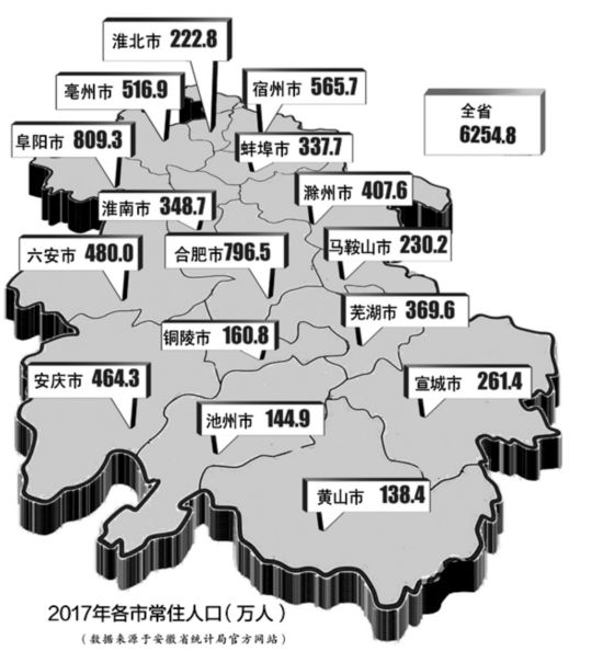 全省16市中,阜陽常住人口最多,達809.3萬人;其次是合肥796.5萬人;宿州和亳州兩市人口超過500萬,分別是565.7萬人和516.9萬人。常住人口最少的三市是銅陵、池州、黃山,分別是160.8萬人、144.9萬人、138.4萬人。