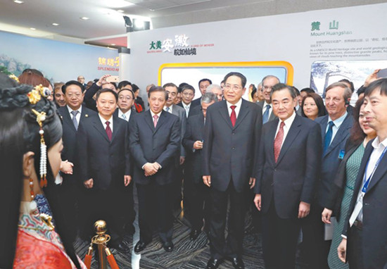 4月11日,外交部部長王毅、省委書記李錦斌、省長李國英與部分大使參觀了“錦繡安徽迎客天下”展覽展示。