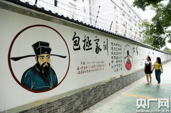 其中,貴池路近200米長的家訓(xùn)墻最為亮眼,該文化墻以《論語》《包拯家訓(xùn)》《朱子家訓(xùn)》《曾國藩家訓(xùn)》等名人家訓(xùn)、國學(xué)經(jīng)典內(nèi)容為主題,輔以工筆畫和水墨畫的人物肖像生動(dòng)展現(xiàn)名人家訓(xùn)、國學(xué)經(jīng)典、賢文化等家國情懷,弘揚(yáng)優(yōu)秀傳統(tǒng)家風(fēng)、家訓(xùn)、家規(guī)。(宋健龍 張大崗攝)