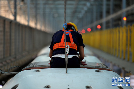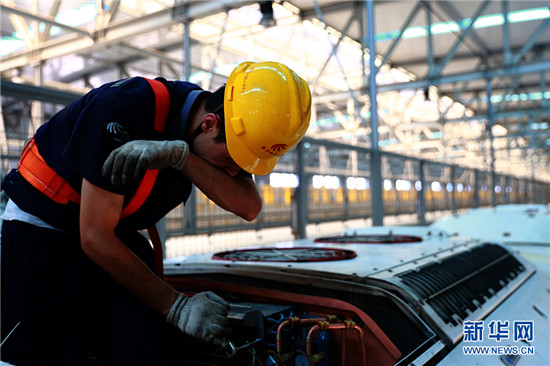在高達(dá)50℃的動(dòng)車(chē)檢修廠內(nèi),工作人員正在為動(dòng)車(chē)“體檢”。新華網(wǎng) 石璐 攝