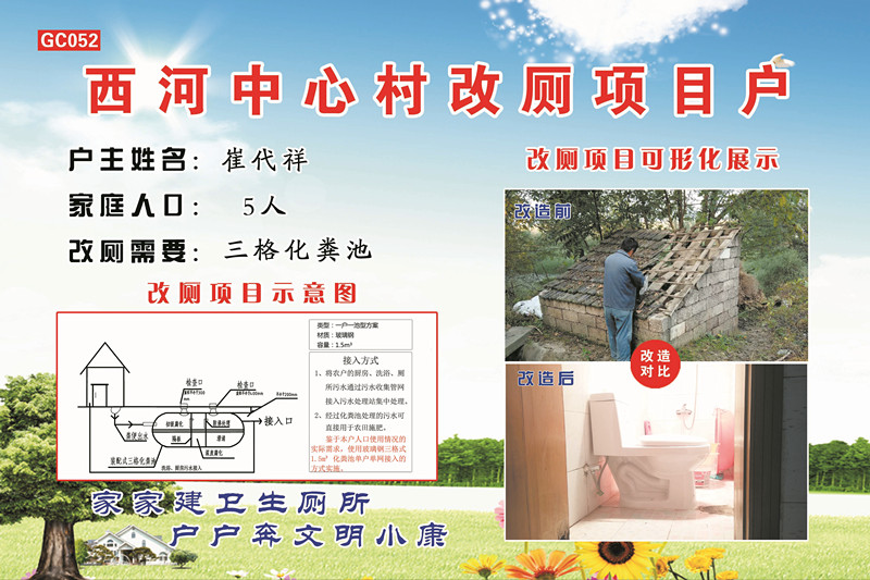 “剛開始進(jìn)行旱廁改造,有的村民不理解,也不配合,以為是在瞎折騰!秉S池鎮(zhèn)西河村支部書記張慶華說,“為了改變村民觀念,我們按照‘典型示范,以點(diǎn)帶面’的原則,用身邊村民實(shí)實(shí)在在的變化,讓不理解的老百姓看到改廁的好處!