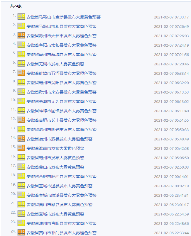 記者注意到,截至2月7日早上7點50分,安徽省有24縣市發(fā)布了大霧預警。