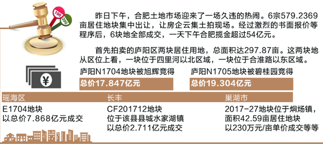 昨日,合肥1月份最后一場(chǎng)土地拍賣圓滿“收官”,六宗地塊使用權(quán)成功轉(zhuǎn)讓,共攬金54.44億元。超過(guò)30家的房地產(chǎn)企業(yè)參與“搶地大戰(zhàn)”,其中,廬陽(yáng)區(qū)超百畝居住用地(位于合淮路以東、棗園路以南)引來(lái)十幾家開(kāi)發(fā)企業(yè)爭(zhēng)搶,最終“花落”旭輝地產(chǎn),最高樓面價(jià)達(dá)到10752元/平方米。合經(jīng)區(qū)88.13畝商業(yè)、居住用地(宿松路以西、紫蓬路以南),將會(huì)引進(jìn)醫(yī)療手術(shù)機(jī)器人運(yùn)營(yíng)企業(yè)區(qū)域總部、研發(fā)中心和應(yīng)用推廣中心入駐。