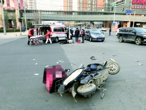 昨日上午8時許,朝陽區(qū)廣順北大街和利澤西街十字路口處,一輛送外賣的電動車與一輛白色轎車相撞,送餐員被撞倒在地,隨即120救護(hù)車及時趕到將其送往醫(yī)院。