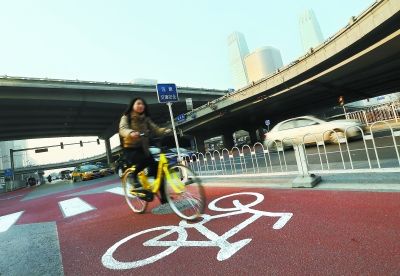 昨天下午,市民在國貿(mào)橋下剛剛鋪設(shè)完成的彩色自行車道內(nèi)騎行。目前,三環(huán)輔路慢行系統(tǒng)整治工作已接近尾聲,全線4.8萬平方米的彩色自行車道及標(biāo)識牌全部鋪裝完成。本報記者