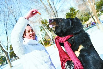 昨天,在北京野生動(dòng)物園人造雪地,黑熊聰聰正和游人互動(dòng)。