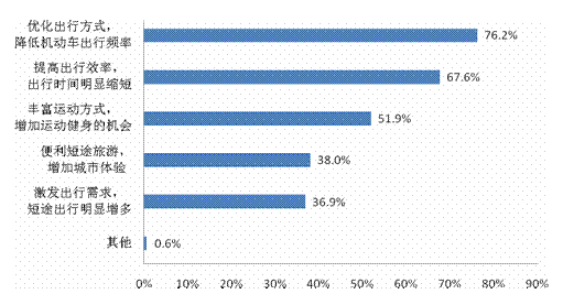 76.2%的被訪居民認為共享單車優(yōu)化了出行方式,降低了機動車出行頻率;67.6%的被訪居民認為提高了出行效率,出行時間明顯縮短;51.9%的被訪居民認為豐富了運動方式,增加了運動健身的機會。