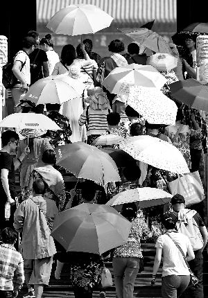 昨天,故宮博物院內(nèi),游客使出各種防曬高招兒。有的打著傘猛喝水,有的用報紙頂頭上,也有的干脆在樹蔭底下躺地上短歇。北京晨報記者 柴春霞/攝