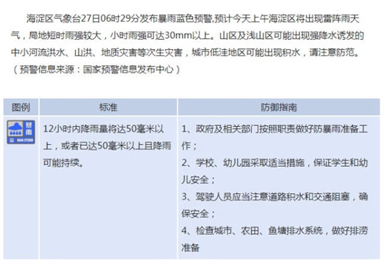 海淀區(qū)氣象臺27日06時29分發(fā)布暴雨藍色預(yù)警,預(yù)計今天上午海淀區(qū)將出現(xiàn)雷陣雨天氣,局地短時雨強較大,小時雨強可達30mm以上。山區(qū)及淺山區(qū)可能出現(xiàn)強降水誘發(fā)的中小河流洪水、山洪、地質(zhì)災(zāi)害等次生災(zāi)害,城市低洼地區(qū)可能出現(xiàn)積水,請注意防范。(預(yù)警信息來源:國家預(yù)警信息發(fā)布中心)